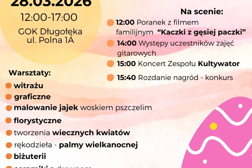 Wielkanoc z Jajem w GOK Długołęka! Zapraszamy Was serdecznie na wyjątkowe, rodzinne wydarzenie pełne świątecznej atmosfery, kreatywności i dobrej zabawy! 28 marca 202612:00–17:00GOK Długołęka, ul. Polna 1A W programie czeka na Was mnóstwo atrakcji:rodzinny seans filmowy „Kaczki z gęsiej paczki”występy uczestników zajęć gitarowychkoncert zespołu Kultywatorrozdanie nagród za konkurs Wielkanocny A przez cały czas trwania wydarzenia:warsztaty […]