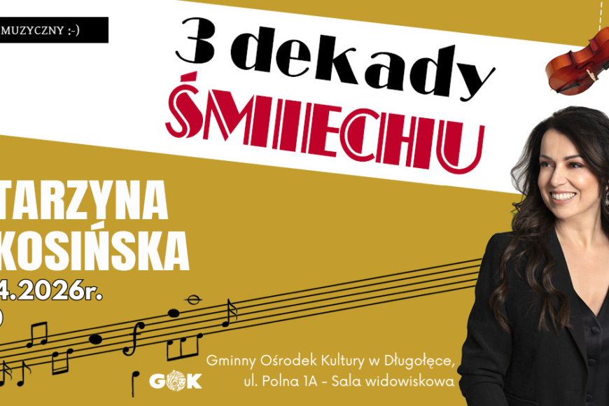 Zapraszamy na kolejne wydarzenie z cyklu Znani z ekranu w GOK, tym razem na scenie Gminnego Ośrodka Kultury pojawi się Katarzyna Pakosińska ze stand upem muzycznym “Trzy dekady śmiechu” 🤩 📍 Gminny Ośrodek Kultury w Długołęce, ul. Polna 1A📅 23.04.26 (czwartek)⏰ Godzina: 19:00 Jak powiedział jeden z krytyków:„Jeżeli śmiech to zdrowie,to ta kobieta jest nieśmiertelna,a […]