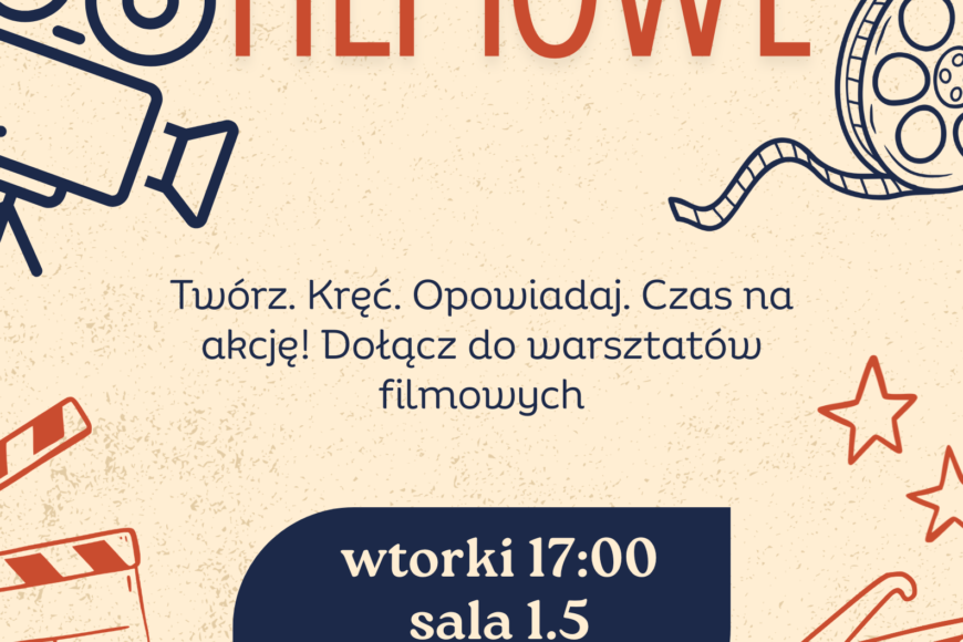 Zapraszamy na zajęcia dla wszystkich, którzy chcą spróbować swoich sił przed kamerą lub za nią. To świetna okazja, żeby rozwijać kreatywność i poznać tajniki tworzenia filmów. Wtorki, godz. 17:00 Sala 1.5 osoby dorosłe Zapisy przez system Luppo Dołącz do nas i zacznij swoją filmową przygodę!